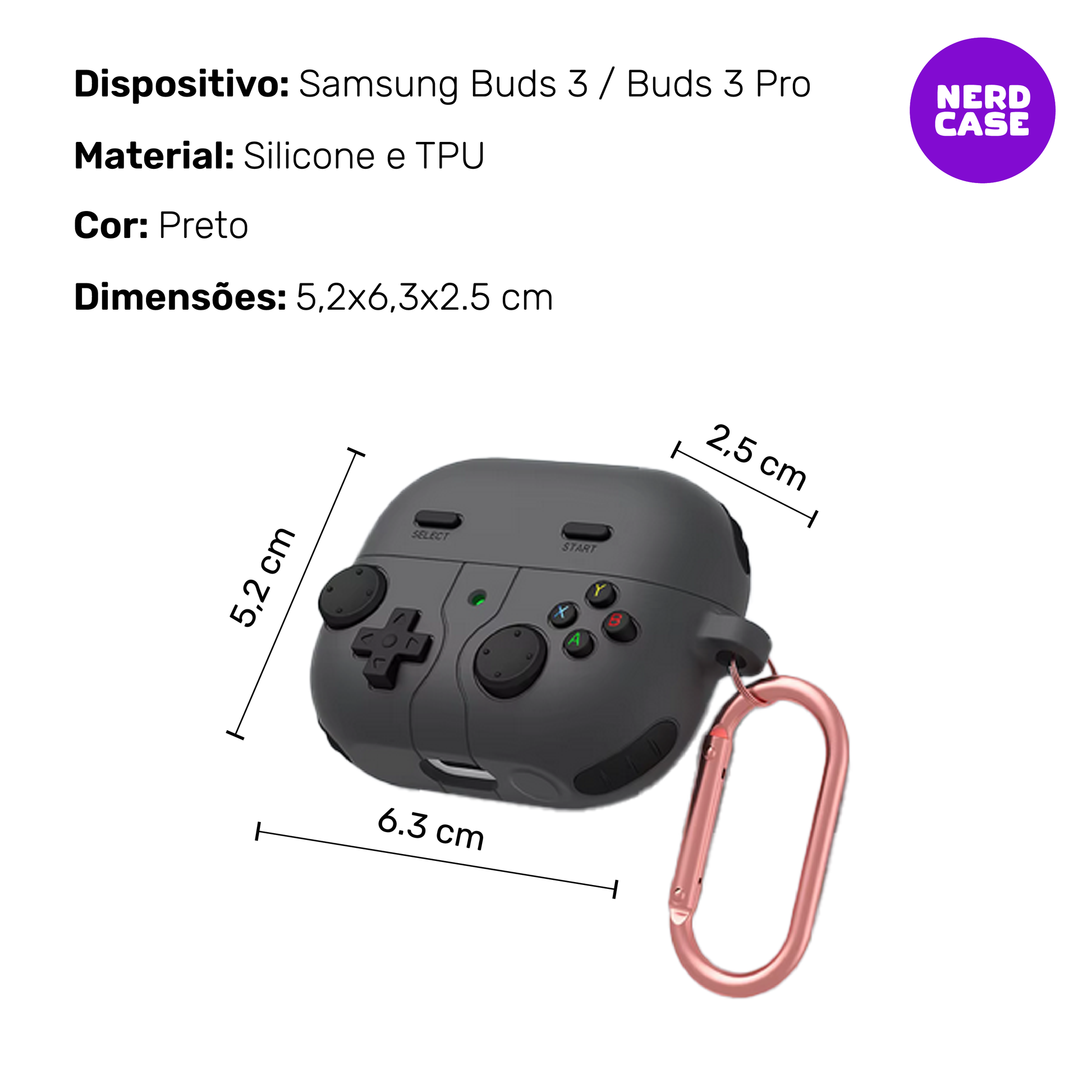 Eleve a proteção dos seus Samsung Galaxy Buds 3 e Buds 3 Pro com esta case única, inspirada no formato de controle de videogame. Feita com materiais premium de silicone e TPU, a case oferece proteção contra quedas, arranhões e poeira, além de permitir carregamento sem fio para maior praticidade. Acompanha mosquetão, perfeito para transporte seguro e prático.